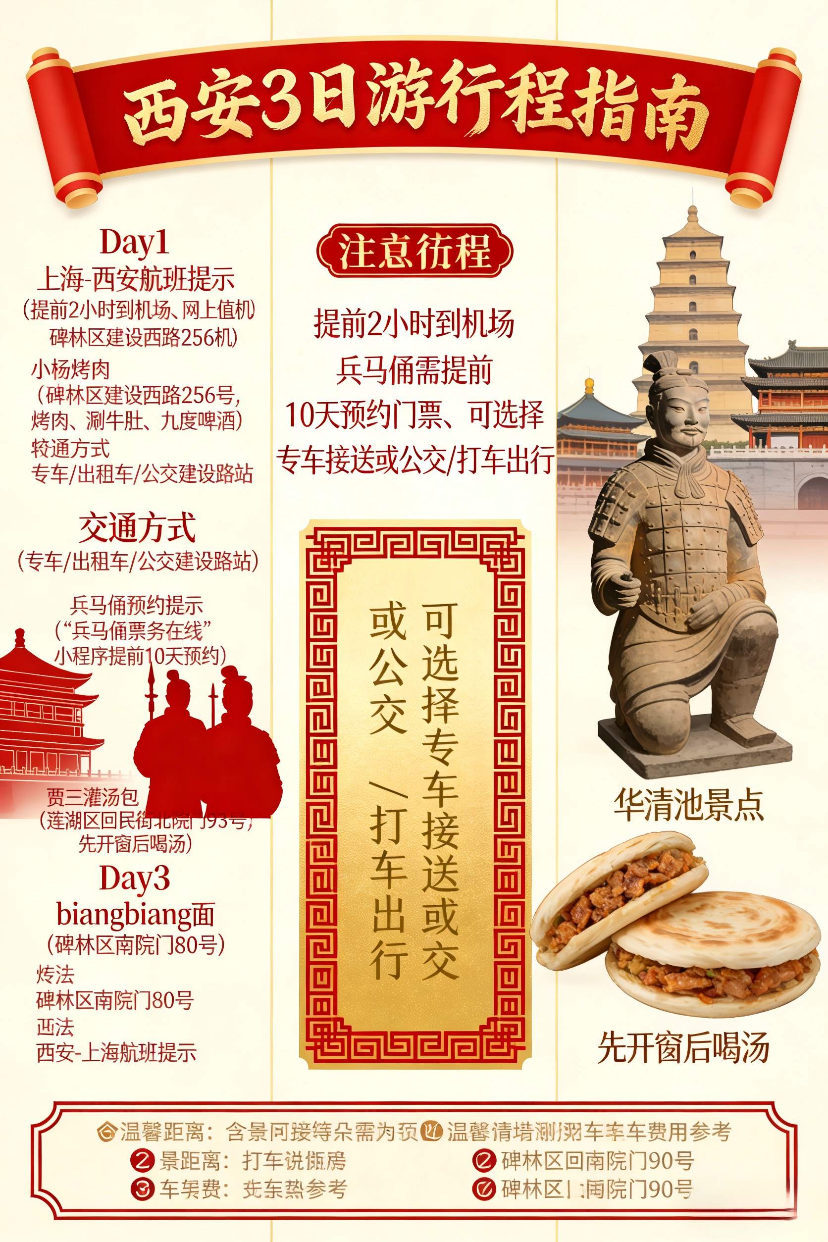 强烈推荐西安这座宝藏古都!三天行程安排得松弛有度,打卡了兵马俑的磅礴震撼、大雁塔的静谧庄严、钟鼓楼的古韵风情,还在回民街大快朵颐,肉夹馍、羊肉泡馍地道又美味。景点交通便利,地铁基本都能直达,住宿选在市中心,出行超省心。这座城既有历史厚重感,又有市井烟火气,玩得太尽兴,下次一定再深度游!